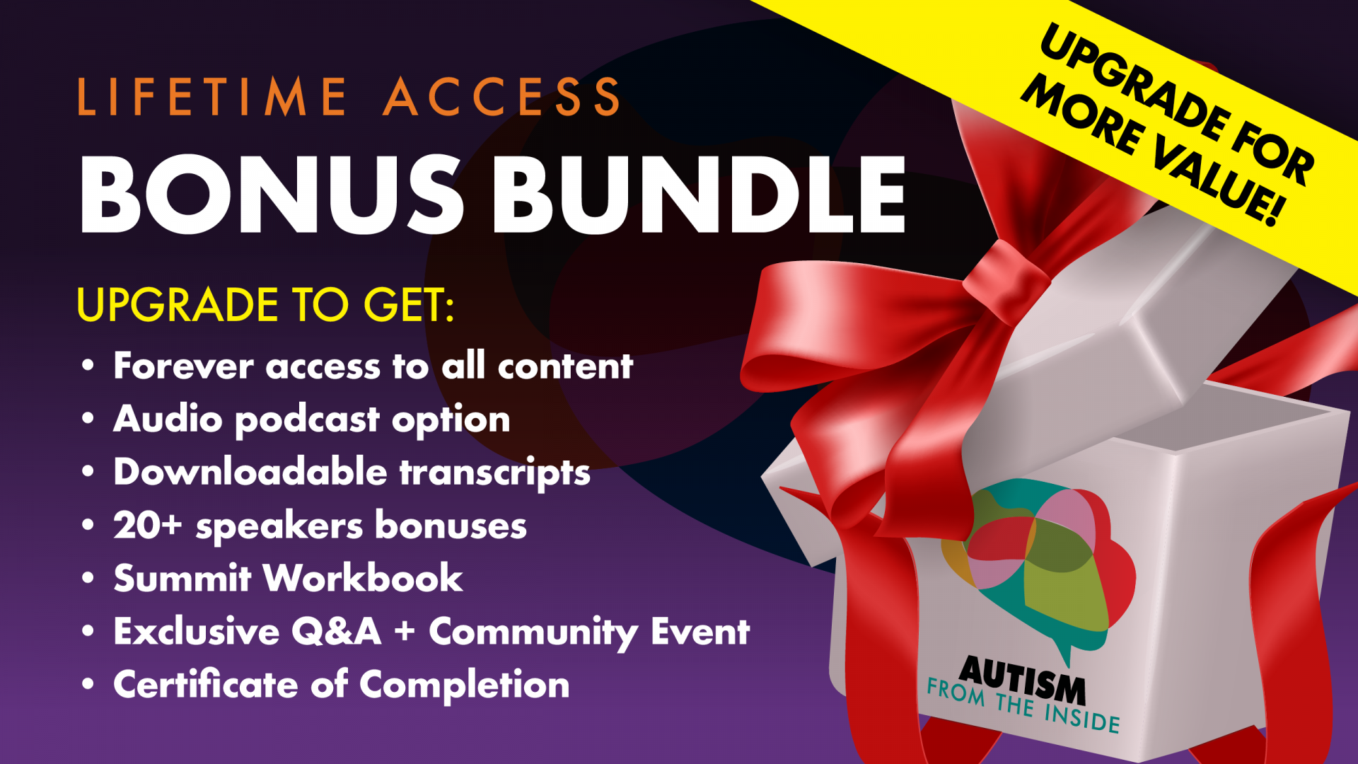 The Lifetime Access Bonus Bundle Upgrade is available for purchase throughout the entire event (at a heavily discounted rate) and will ensure that you'll have lifetime access to all of the speaker presentations PLUS bonus content from every speaker AND access to exclusive community events. Upgrade today to keep these incredible resources at your fingertips forever!